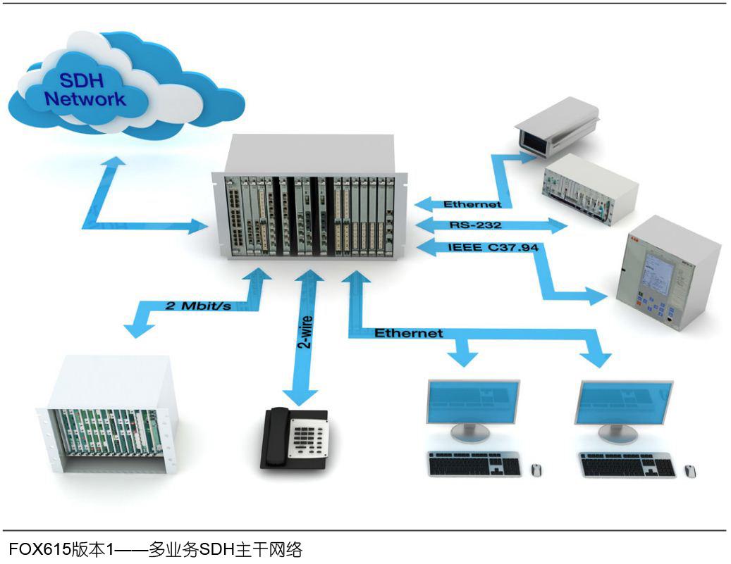 在传输方面,FOX615提供高达STM-16的容量,可以构建起大区域的通信网络。集成的接入和传输复接器功能大幅度地降低了OPEX和所需的空间,因为只需要安装和维护一套设备,不需要在各个设备之间进行接线。另一个好处就是只需要一套用于配置的网络管理工具。
